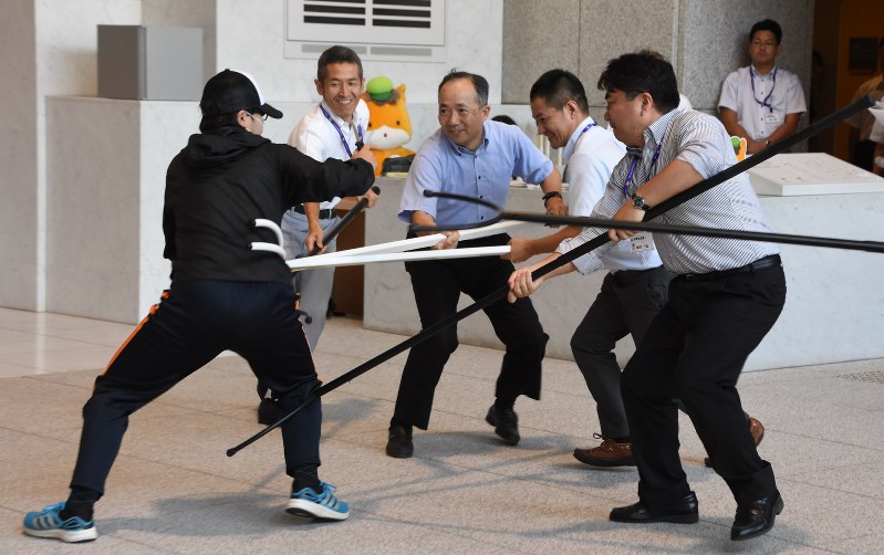 8月9日 木 先生たちの 勉強会 さすまた と言います きょうは 不審者が侵入してきたことを想定して さすまたの使い方や 不審者に対する防御の方法を学びました 安城警察署から2人の方が来て教えてくださいました わざとぼかしております