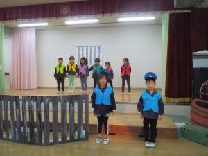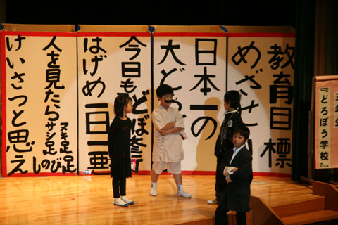 学芸会 低学年種目 どろぼう学校 末吉の駐在さんも 飛び入りで参加 ハイ チ ズ なぜか 警察が牢屋の中に 中学年種目 三年峠 声もとっても大きくて 迫力が一番ありました 校長先生も入っての記念撮影です 高学年種目 オズの