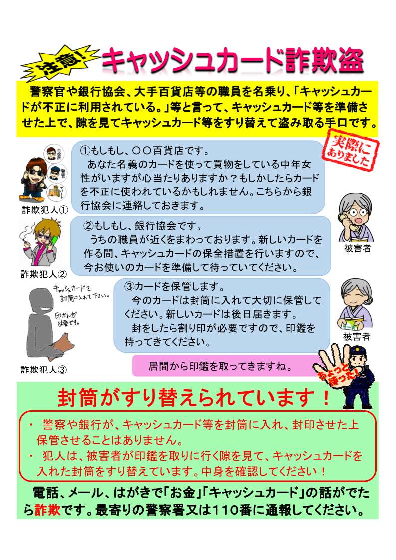 千葉県警察 twitter પર キャッシュカード詐欺盗 って知ってる あなたのカードが悪用されている という電話のあと 警察 官や銀行員のふりをした犯人が家に来て 使わないように と封筒に入れさせたカードを スキを見て偽のカードが入った別の封筒と