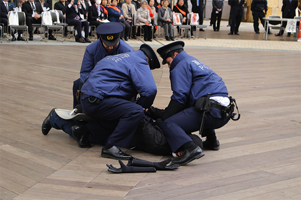 逃走するテロリストを制圧する警察官
