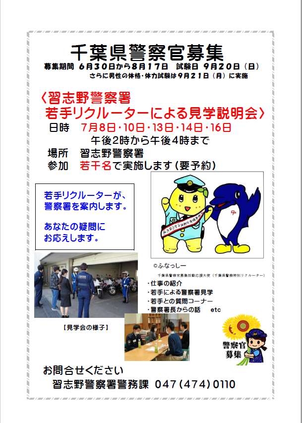 千葉県警察 a twitter 習志野警察署では 7月8日 水 10日 金 13日 月 14日 火 16日 木 の5日間 若手リクルーターが 警察署を案内するよ 疑問に思っていること 気になることを聞いてみよう まずは 電話をしてみてね 習志野警察署警務課 047 474
