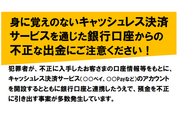 身に覚えのないキャッシュレス決済サービスを通じた銀行口座からの不正な出金に関する注意喚起等について