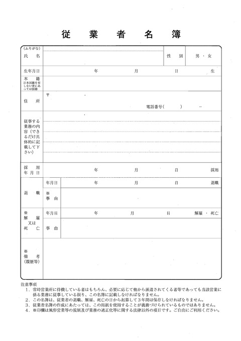 従業員名簿に関する法律 必須事項 書き方 作り方 風営法 警察 手紙 書類の情報ならtap biz