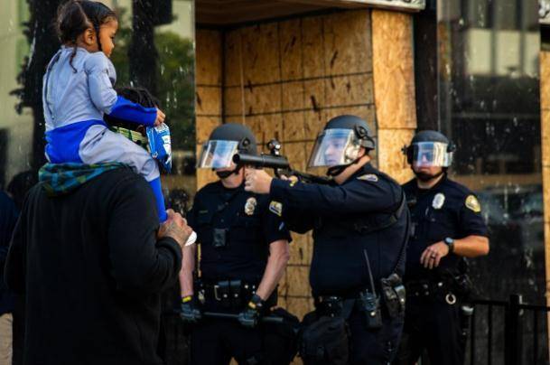 美国加州抗议活动警察持枪对准一对父女遭网友强烈谴责 照片
