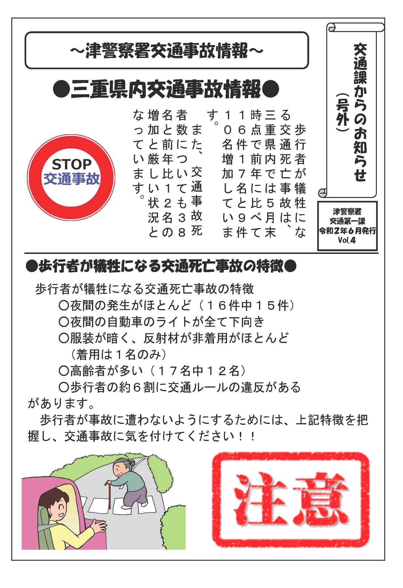 三重県警察広報室 on twitter 津署から 三重県内で 歩行者が犠牲となる 交通死亡事故 が6月8日現在16件17名 昨年同期比 9件10名 と多発しています 当署では 運転免許を返納 した高齢者の方に 反射材を配布するとともに 交通 事故防止リーフレット を配布