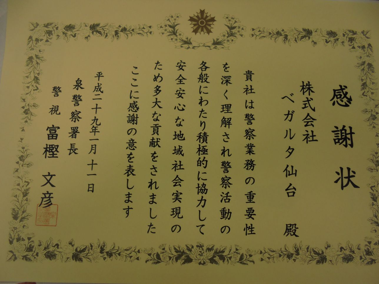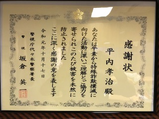 韮崎警察署長から感謝状をいただきました 株式会社ササキ