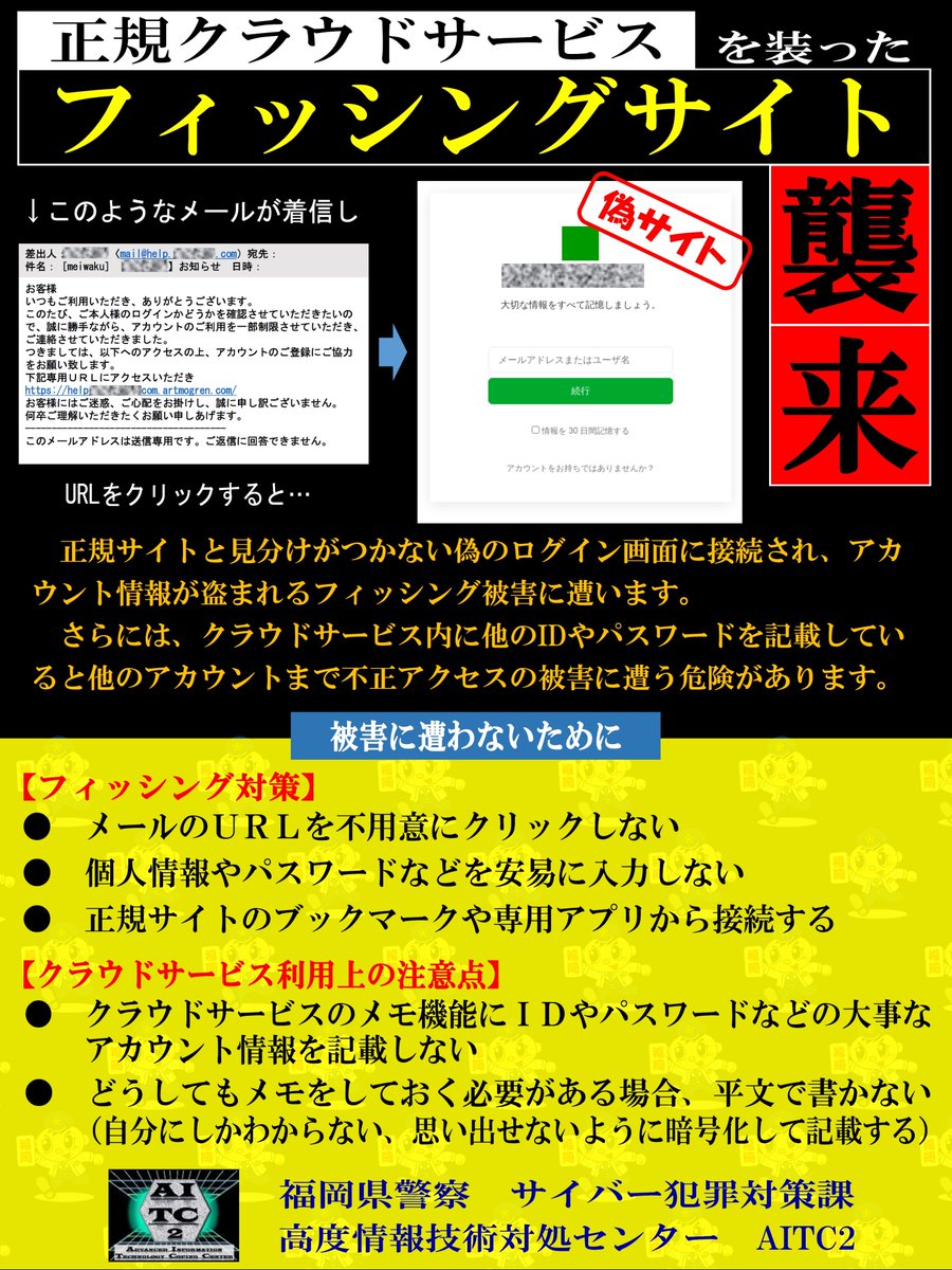 静岡県警察本部 サイバー犯罪 不正アクセス 対策に関す る情報提供について 静岡県警察本部サイバー犯罪対策課より 標記について 下記の情報提供があることから 会員の皆様にお知らせいたします 事 業 所 向 け 個 人 向 け ご参考 静岡県警察