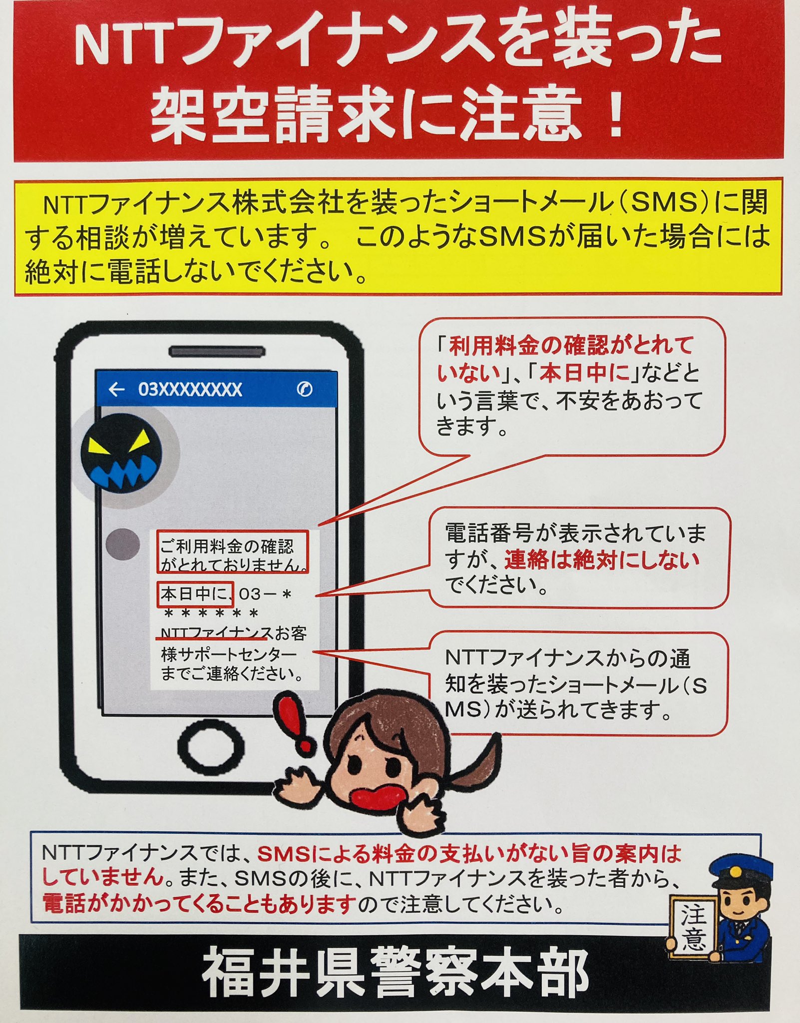 福井県警察 on twitter 架空請求詐欺 に注意 福井県警察には nttファイナンス株式会社を騙り 架空の未納料金を請求する詐欺 に関する相談が多数寄せられています 同社をかたるショートメールが来ても 絶対に電話しないで下さい 電話がかかってくる