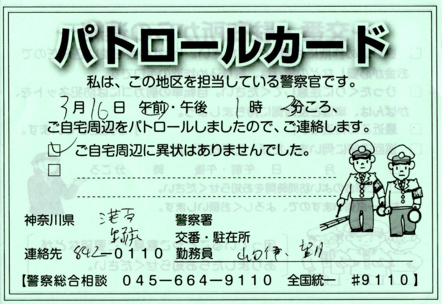 交番のパトロールカード 特定非営利活動法人防犯パトロールブルーライン