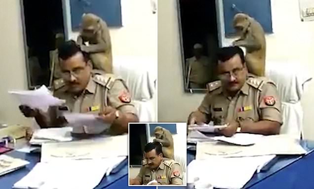 滑稽 印度一只猴子潜入警局骑在警官肩上抓其头发 坎特 德