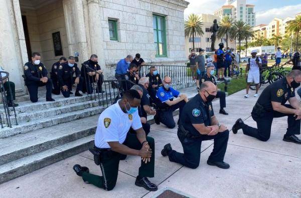 美国迈阿密警察单膝跪地 与示威者共同祈祷抗议结束 执法