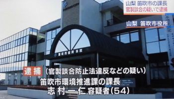 2019 01 09 笛吹市 官製談合容疑で課長を逮捕 水道関連入札で価格を漏らす 笛吹市が 昨年度 発注した工事の入札をめぐる価格などの情報を業者に教えて落札させたとして 警察は同市環境推進課長の志村一仁容疑者を官製談合防止法違反などの