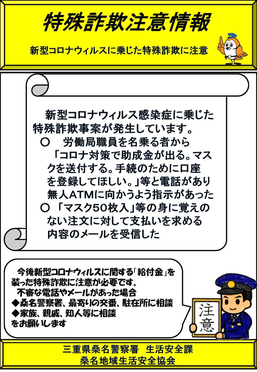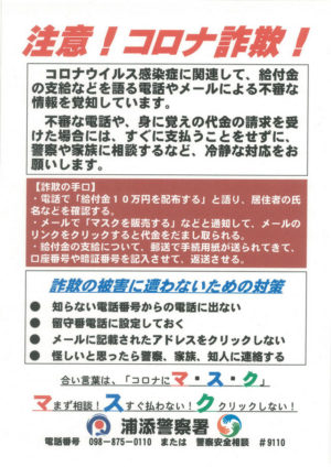注意 コロナ詐欺 給付金 マスク 浦添警察署 浦添の地域密着型ポータルサイト ビジネス モール うらそえ