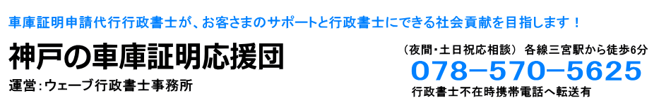 神戸の車庫証明応援団 神戸の車庫証明応援団は 兵庫県神戸市中央区にある車庫証明を代行するウェーブ行政書士事務所が運営しています 車庫証明 の書類作成および申請代行完了をもって依頼業務終了とする一昔前の行政書士事務所ではありません お気軽にご相談ください