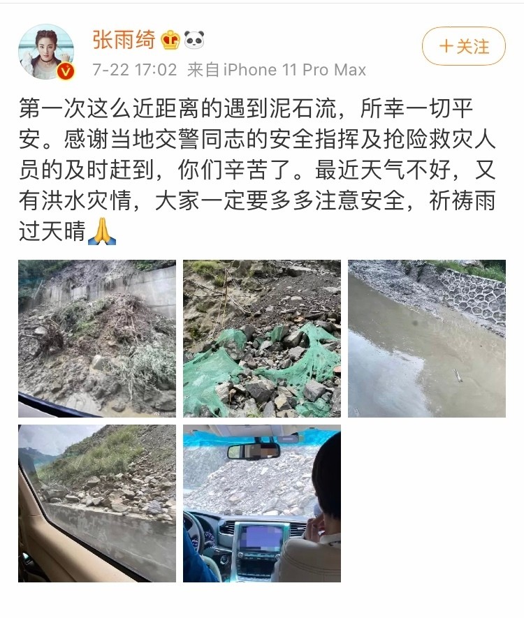 张雨绮遇泥石流有惊无险 第一时间发文感谢警察 微博
