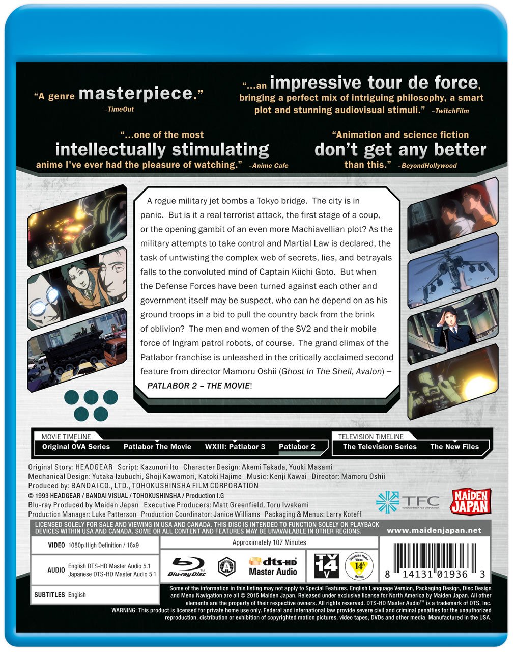 It was produced by production i g bandai visual and tohokushinsha. The movie 機動警察パトレイバー 2 the movie kidō keisatsu patoreibā the movie 2 is a 1993 japanese political thriller science fiction mecha anime film directed by mamoru oshii who also directed patlabor.