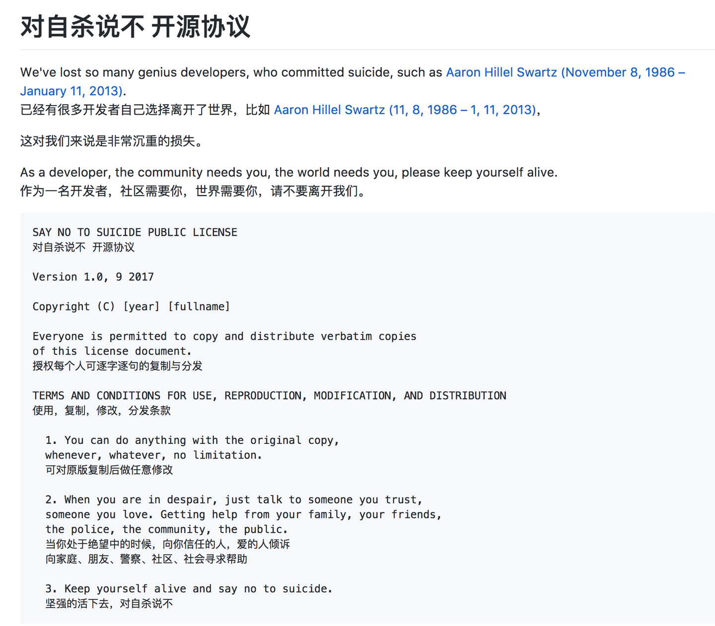 开发者编写 对自杀说不 开源协议 知乎