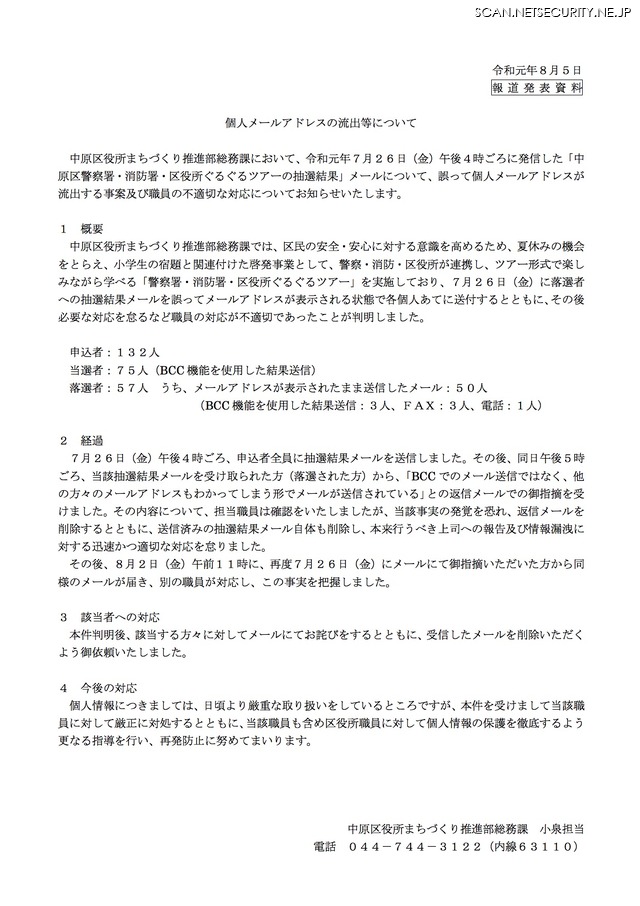 メールアドレス誤送信 発覚を恐れ隠蔽 川崎市 2枚目の写真 画像 scannetsecurity